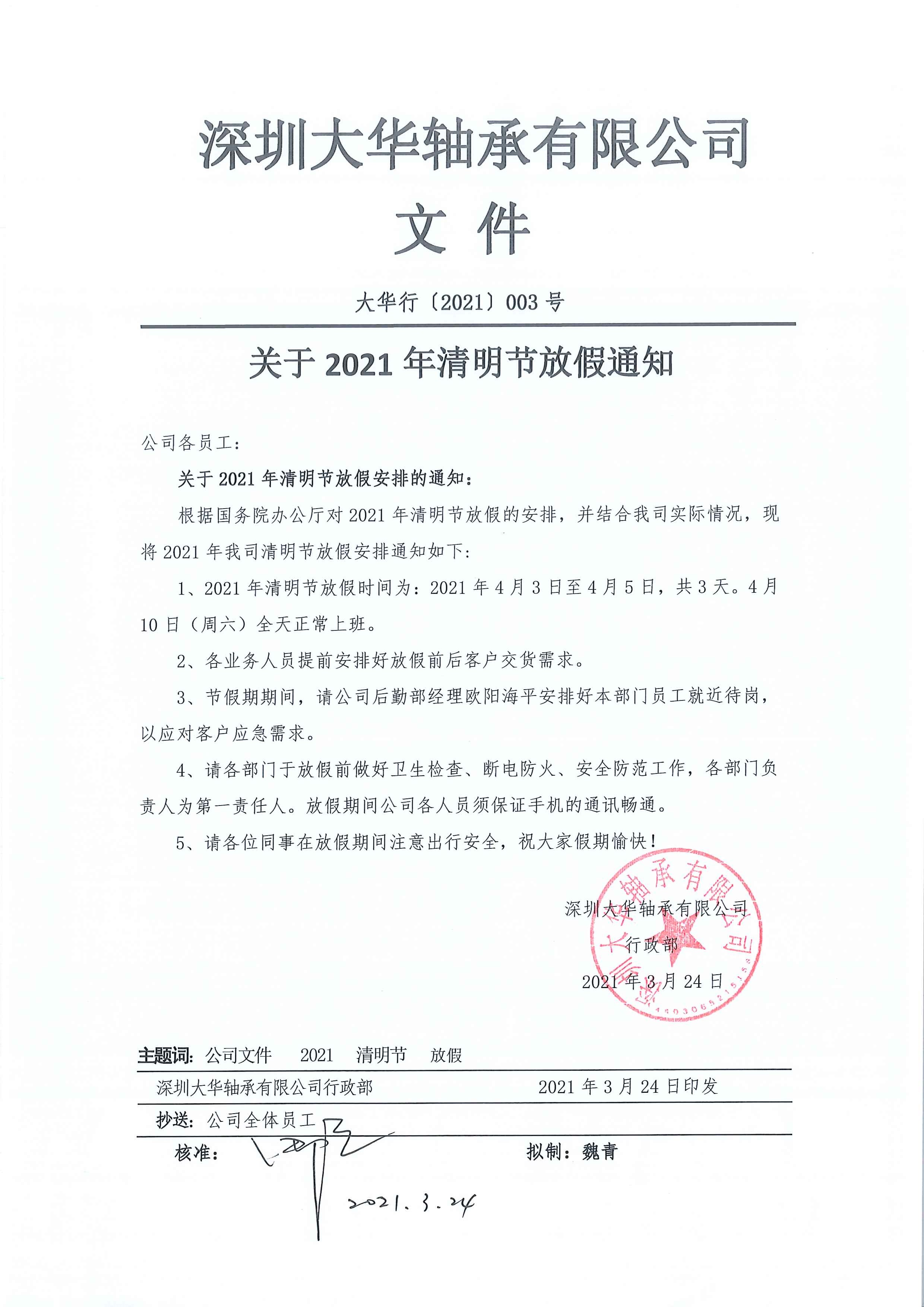 深圳大華軸承有限公司2021年清明節(jié)放假通知